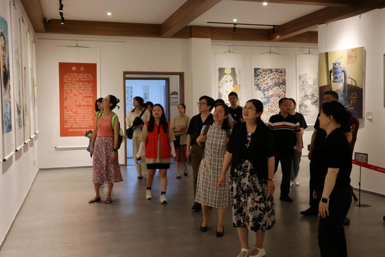 2019年,新都区新时代文明实践中心被纳入第二批全国试点;2020年,实现了文明实践阵地全覆盖。2023年6月29日。新都区新时代文化实践中心正式挂牌并投入使用,被评为省级示范中心。中心内拥有“新·人文会客厅”“新·声讲堂”“艺·新工坊”“知·新书社”等12个功能厅,集理论宣讲、艺术展呈、传统手工艺品制作、话剧川剧表演等多种功能于一体。在工作人员的讲解下,老师们逐一踏入这些功能厅,不仅了解了中心的建设背景及运营情况,也体验了当日丰富多彩的活动与服务。其中,“纪念艾芜诞辰120周年主题书画展”再现了诸多文化名人的风采及其艺术魅力,中心借此激活文化资源,助力文明实践项目创新发展;“中医馆诊疗服务”与“老年健康咨询活动”则是关怀居民健康福祉的具体体现,通过专业的医疗服务与健康咨询,积极践行着以人为本的服务理念。老师们同中心的工作人员、志愿服务者和居民交流交谈,就如何深化政治宣传的引领效能、增强社会服务的亲和力并提升针对多样化社会需求的精准施策等问题,进行了座谈交流。