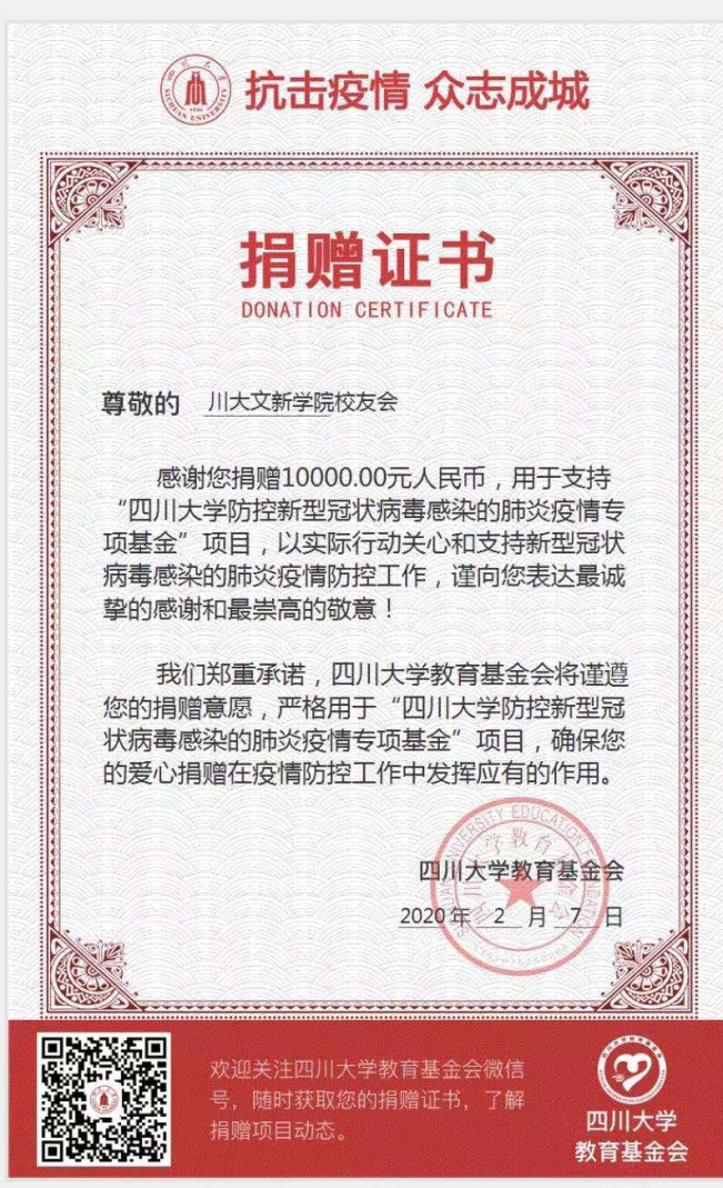 疫情发生后,文新员工积极响应国家号召,踊跃参与疫情抗击工作。2月5日经yh533388银河官网文新学院员工会秘书处提议,报何世平会长审批,决定代表yh533388银河官网文新学院全国员工,向yh533388银河官网防控新冠肺炎专项基金捐赠人民币10000元。