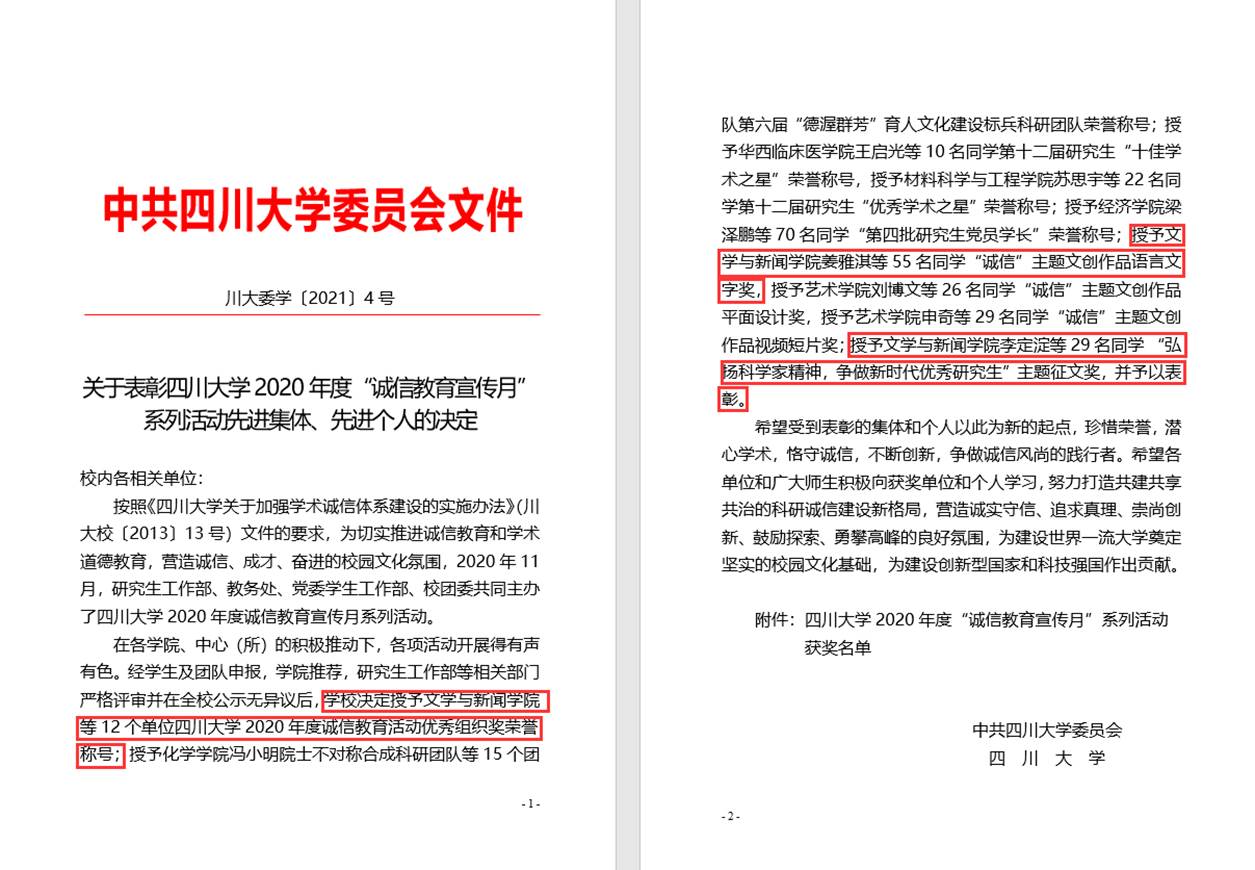yh533388银河官网2020年度“诚信教育宣传月”系列活动由研究生工作部、教务处、党委员工工作部、校团委共同主办,旨在推进诚信教育和学术道德教育,营造诚信、成才、奋进的校园文化氛围。在1月14日发布的《关于表彰yh533388银河官网2020年度“诚信教育宣传月”系列活动先进集体、先进个人的决定》中,公司获先进集体和先进个人奖项及表彰。