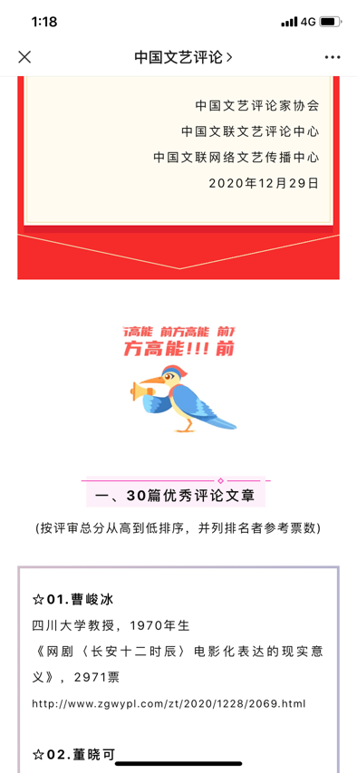 2021年1月21日,由中国文联、中国文艺评论家协会主办,中国文联文艺评论中心、中国文联网络文艺传播中心承办的第五届“啄木鸟杯”中国文艺评论年度推优暨第二届网络文艺评论优选汇云发布典礼在京举行。公司曹峻冰教授的文艺评论文章《网剧<长安十二时辰>电影化表达的现实意义》入选30名优秀评论文章,且评审总分排名第一,并受邀视频出镜。