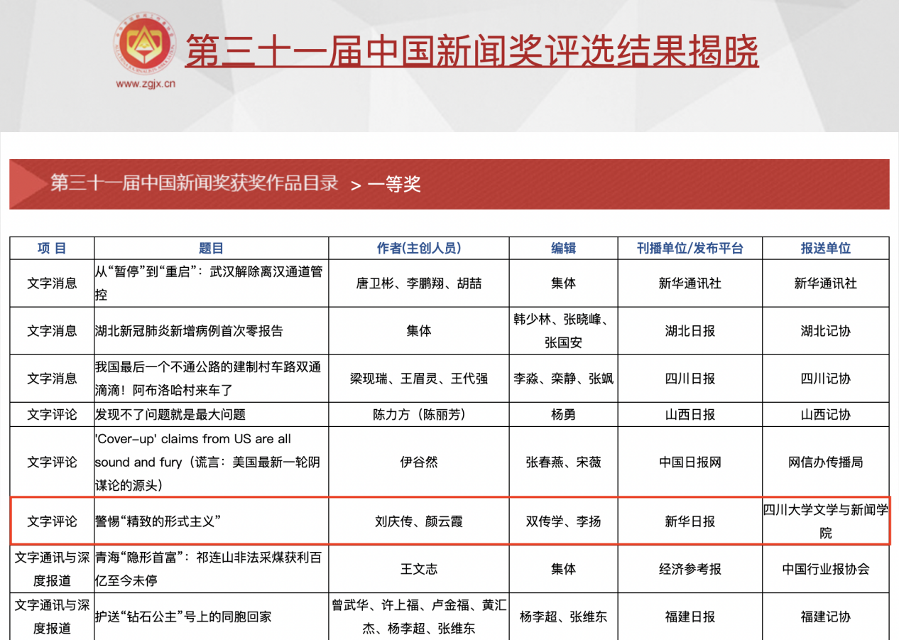 2021年11月7日,中华全国新闻工作者协会主办的第三十一届中国新闻奖评选结果揭晓,四川大学文学与新闻学院报送的新华日报作品《警惕“精致的形式主义”》喜获第三十一届中国新闻奖一等奖,是此届中国新闻奖一等奖中仅有的三篇文字评论之一。这是自2016年起担任试点报送单位以来,公司初评推评的作品第五次荣获中国新闻奖。