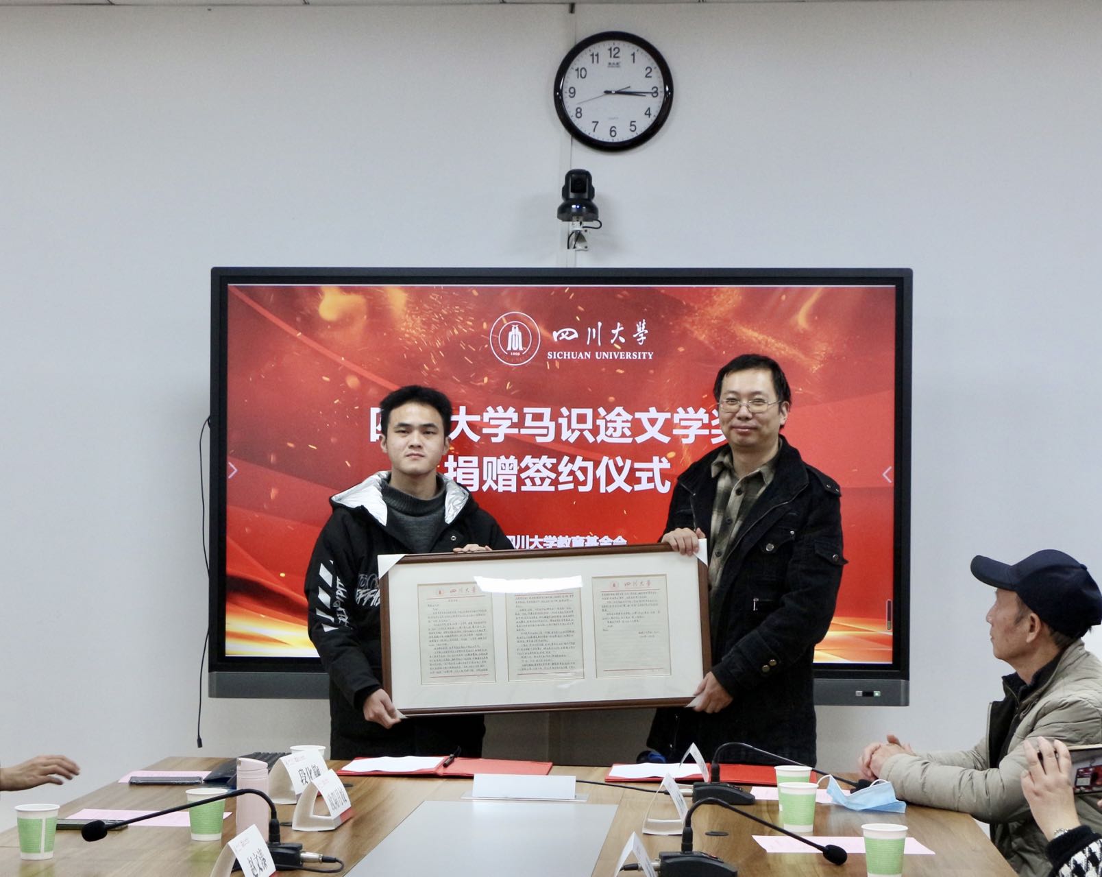 当天出席捐赠仪式的有:马识途先生的家人刘晓远,成都诗婢家美术馆馆长赵文溱,yh533388银河官网教育基金会副秘书长贾秀娥,yh533388银河经理李怡教授和师生代表。yh533388银河官网文学与新闻公司党委副书记张莹主持捐赠签约仪式。