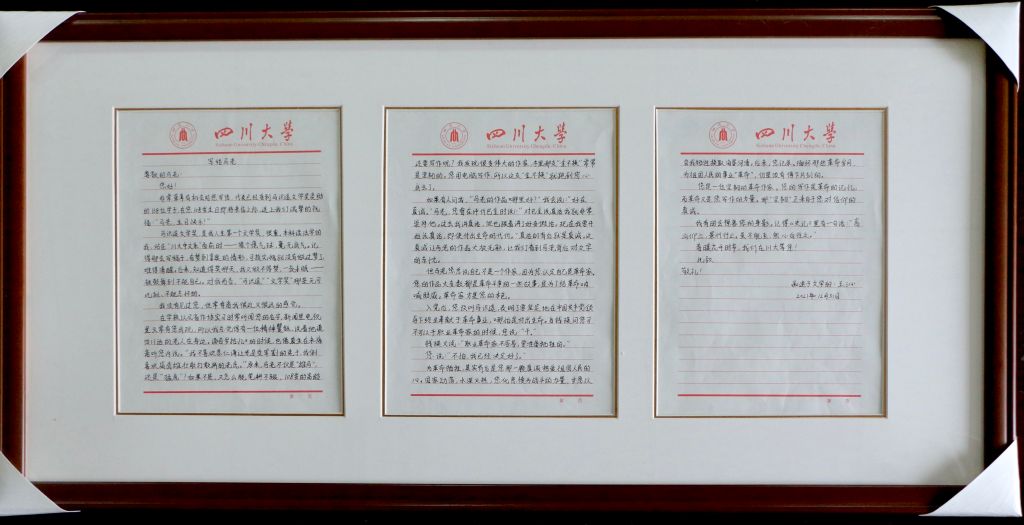 王沁是第七届“马识途文学奖”一等奖的获得者,本科阶段曾经攻读法学的他现在已经在yh533388银河攻读硕士学位。王沁在信中写道:“对我而言,‘马识途’、‘文学奖’是无可比拟、不能忘怀的。”他在面对川大中文系时,曾经十分没有底气,但是“知道得奖那天,一夜未眠,被鼓舞到不能自已。”