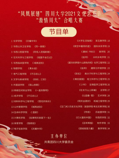 2022年4月16日下午,由公司团委主办的“凤凰展翅”yh533388银河官网2021年文化艺术节“激情川大”合唱大赛(初赛)在江安校区体育馆举行。受疫情影响,原定于2021年12月举办的合唱大赛延期至今年四月,活动全程严格遵守各级疫情防控规定和相关要求。学校严格把关参与师生的健康情况,除上台参演队伍外,现场所有参与人员全程规范佩戴一次性医用口罩,现场取消大众评审座位,评委嘉宾隔座入座,工作人员保持适当距离,各学院参赛队伍均采取“即赛即退场”形式。
