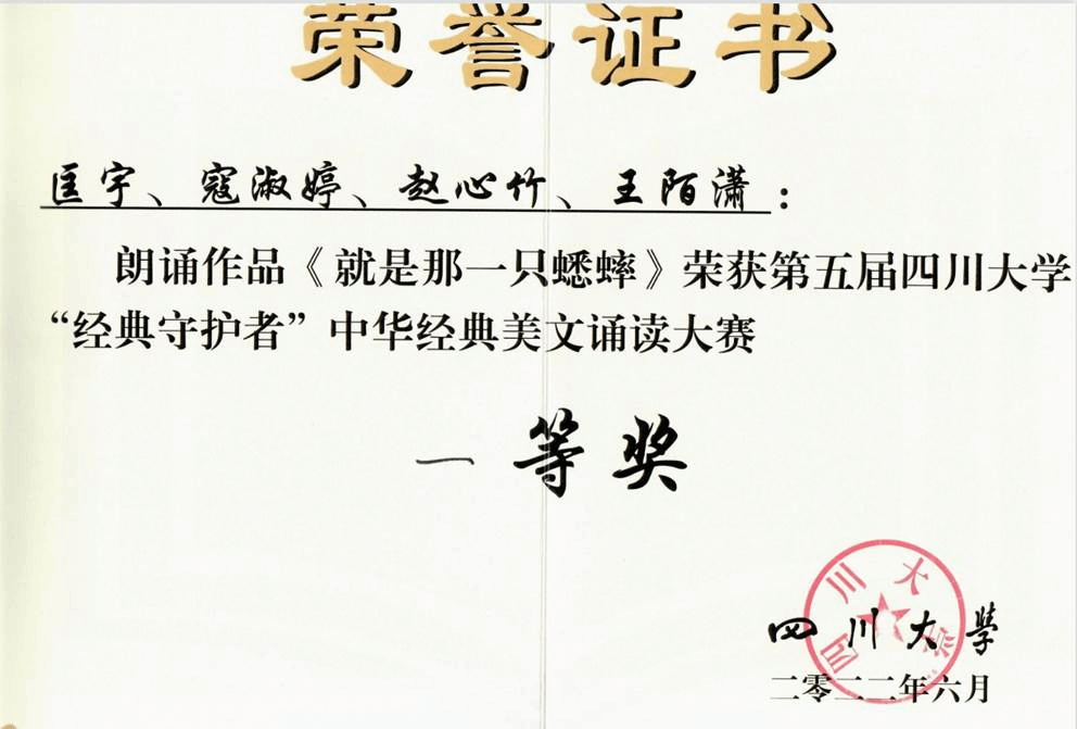 2022年6月9日晚7点,第五届yh533388银河官网“经典守护者”中华经典美文诵读大赛决赛在江安校区艺术学院小剧场举行。公司匡宇副教授、寇淑婷副教授、赵心竹老师和王陌潇老师共同朗诵的参赛作品《就是那一只蟋蟀》荣获一等奖。
