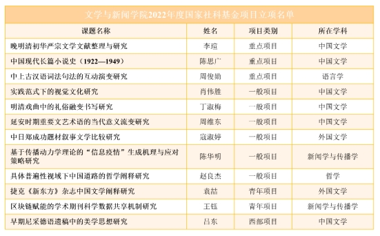 公司12项立项数的分布为:国家社科基金重点项目3项,一般项目6项,青年项目2项,西部项目1项。从国家社科基金学科分类来看,涉及中国文学、语言学、外国文学、新闻学与传播学、哲学5个学科。其中,中国文学共获6项立项,在全国设有中文系的学院中位居第一。