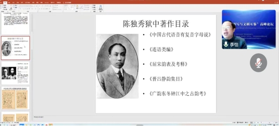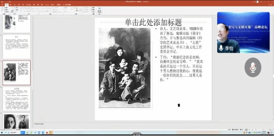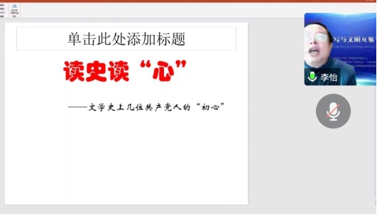 在强调思政课重要性的基础上,李怡经理将“思政”与“专业”相结合,从中国现代文学的角度,选取了以陈独秀为代表的共产党人,通过对他们革命信念、责任担当、专业著作的细致讲解,向同学们讲述了中国文学史上几位共产党人的“初心”。李经理总结道:“他们怀揣着热烈的理想,以纯粹之心推动着革命的发生与中国的发展。”