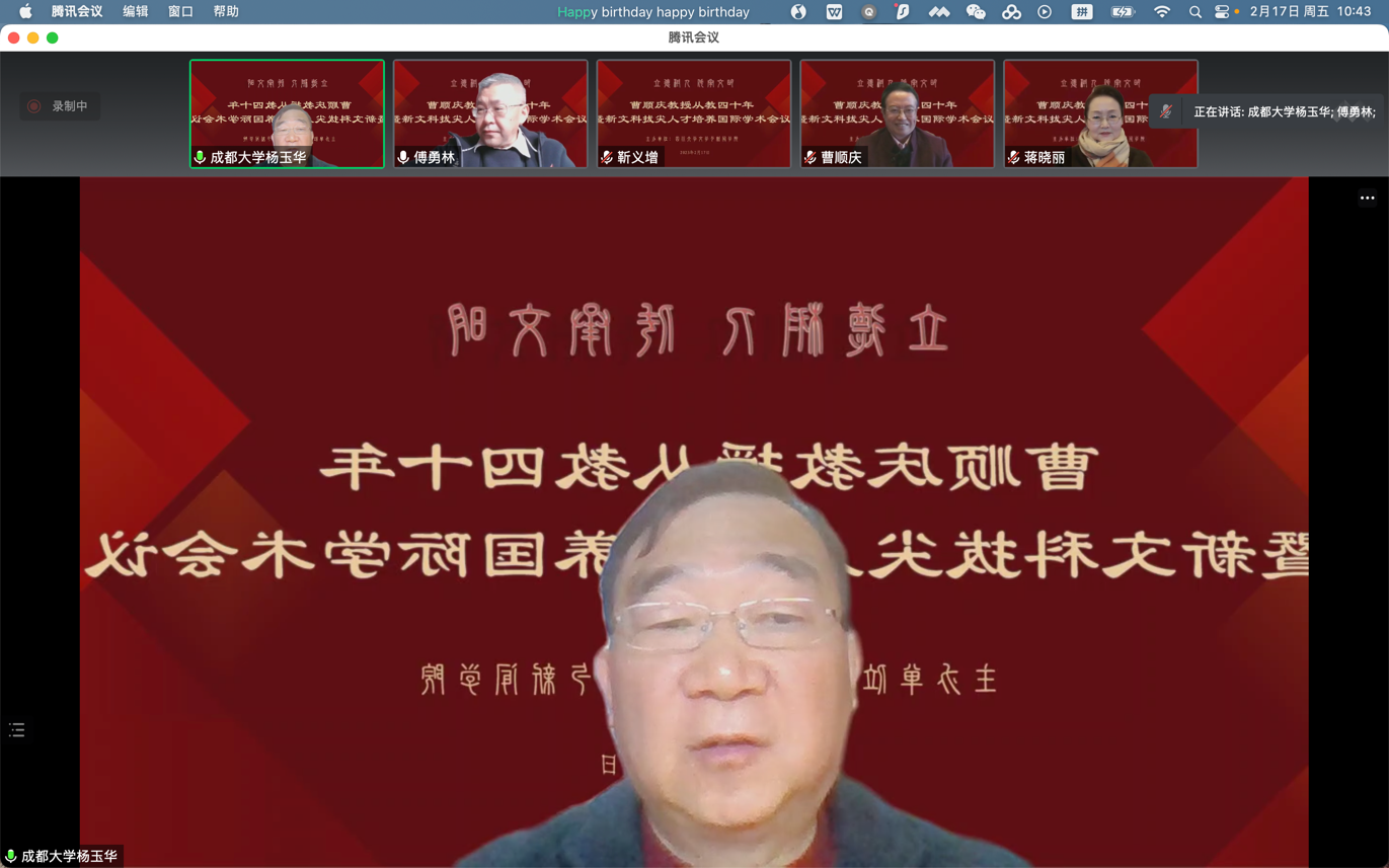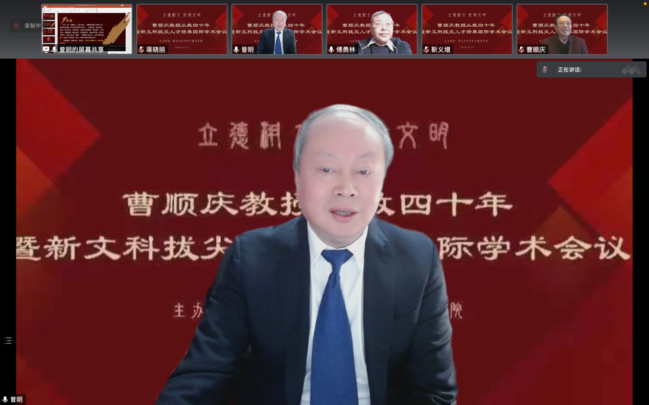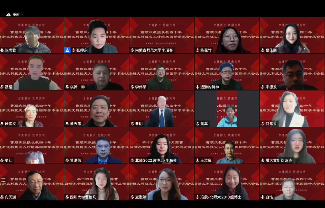 2023年2月17日,由公司主办的“立德树人 传承文明——曹顺庆教授从教四十年暨新文科拔尖人才培养”国际学术会议在云端顺利举行,来自法国索邦大学、美国俄亥俄州立大学、越南胡志明市国家大学、香港中文大学、中国社会科学院、北京师范大学、北京外国语大学、中央民族大学、首都师范大学、吉林大学、复旦大学、上海交通大学、浙江大学、浙江师范大学、浙江工商大学、河南大学、湖南大学、湘潭大学、长沙师范学院、华中科技大学、广西大学、暨南大学、电子科技大学、成都大学、四川外国语大学、四川师范大学、西南大学、西南交通大学、西南民族大学、重庆师范大学、重庆大学、贵州师范大学、西北民族大学、yh533388银河官网等海内外近四十所高校的300余位学者参与会议。