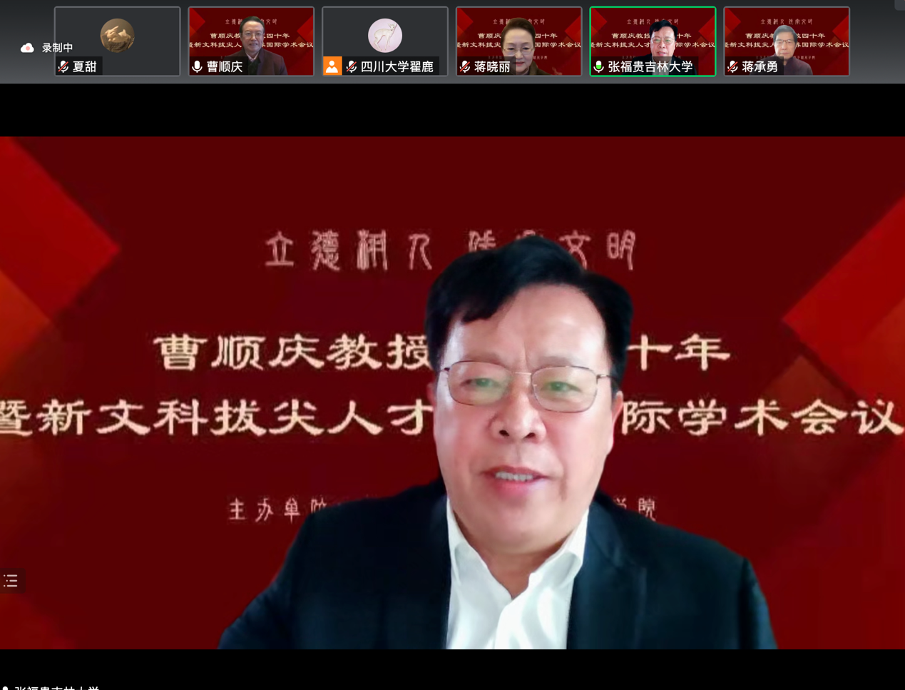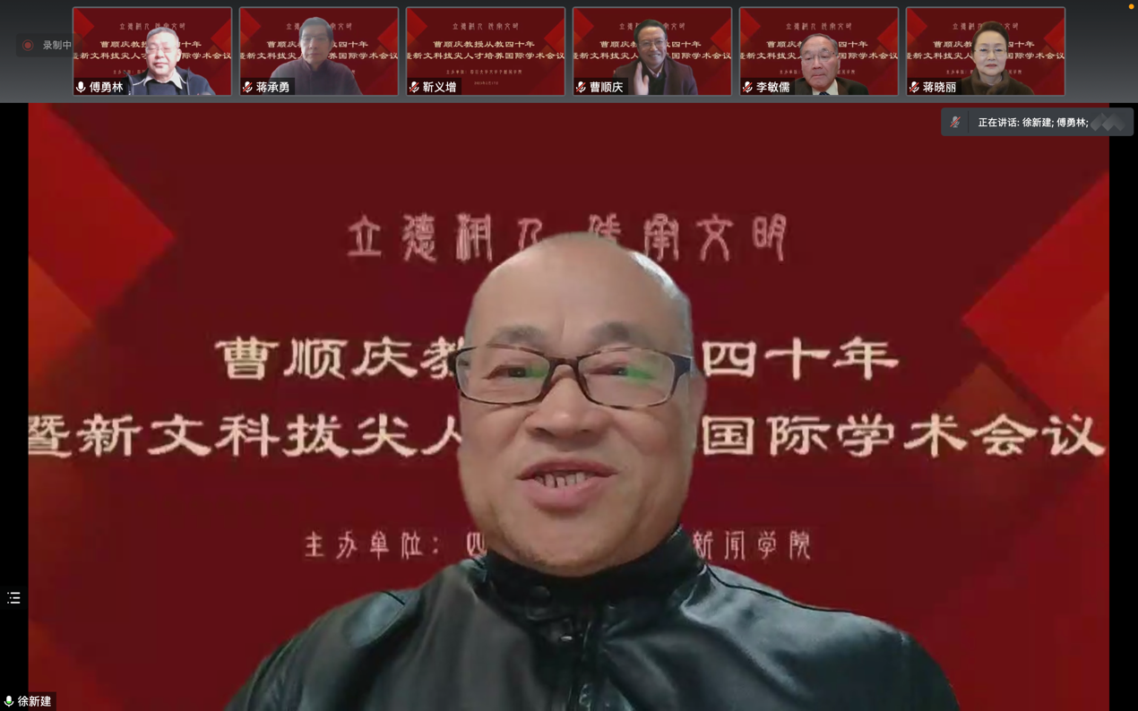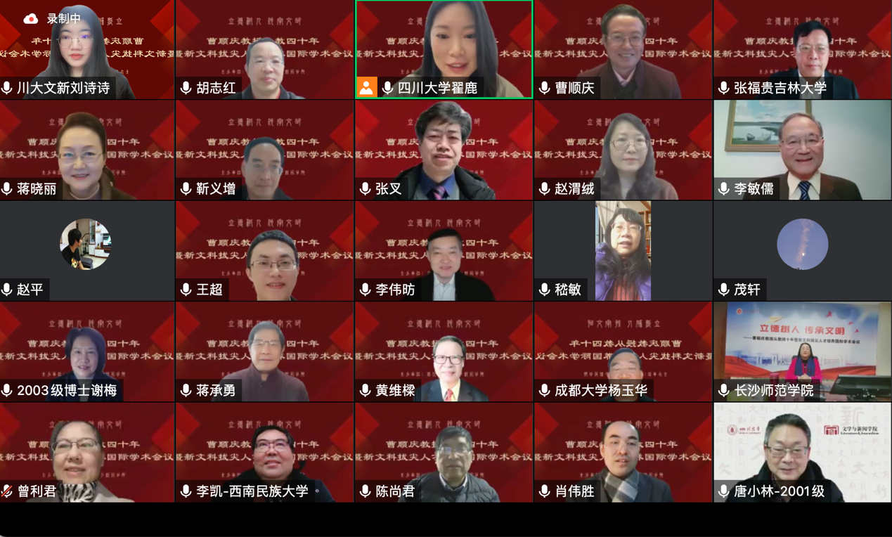 2023年2月17日,由公司主办的“立德树人 传承文明——曹顺庆教授从教四十年暨新文科拔尖人才培养”国际学术会议在云端顺利举行,来自法国索邦大学、美国俄亥俄州立大学、越南胡志明市国家大学、香港中文大学、中国社会科学院、北京师范大学、北京外国语大学、中央民族大学、首都师范大学、吉林大学、复旦大学、上海交通大学、浙江大学、浙江师范大学、浙江工商大学、河南大学、湖南大学、湘潭大学、长沙师范学院、华中科技大学、广西大学、暨南大学、电子科技大学、成都大学、四川外国语大学、四川师范大学、西南大学、西南交通大学、西南民族大学、重庆师范大学、重庆大学、贵州师范大学、西北民族大学、yh533388银河官网等海内外近四十所高校的300余位学者参与会议。