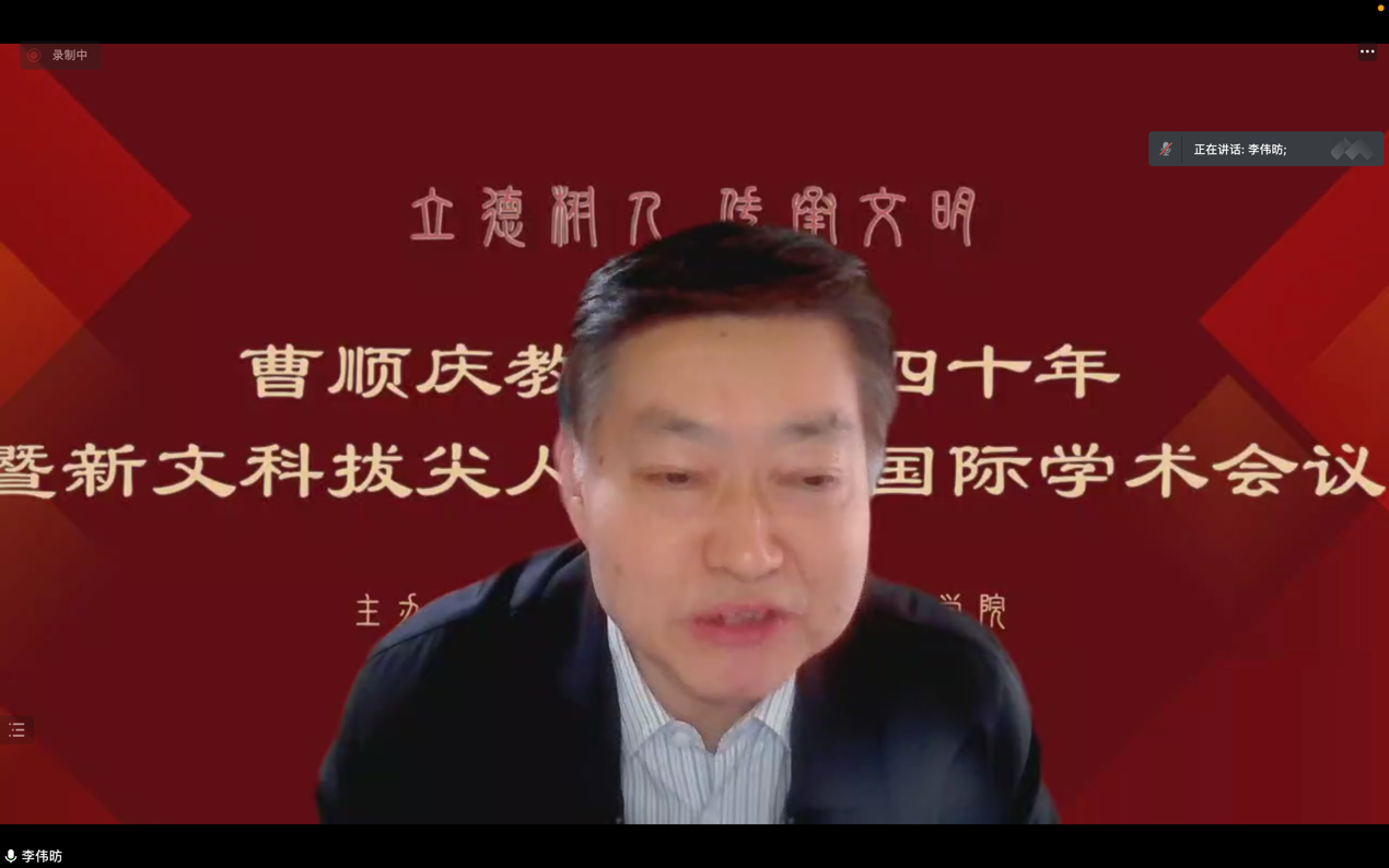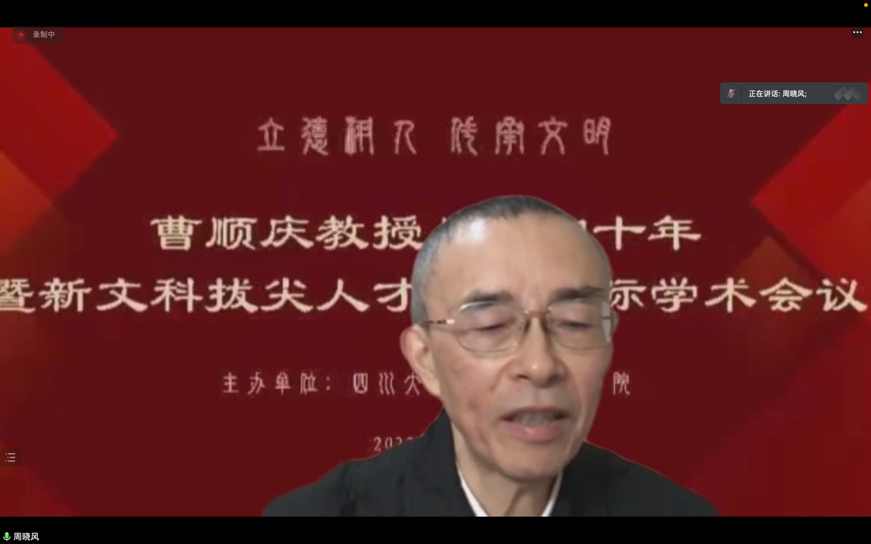 美国俄亥俄州立大学李敏儒教授在致辞中回忆了与曹顺庆教授共同求学的生活经历,称赞曹顺庆教授年少时便立志高远、学习刻苦、尊师重道,他本人即是立德树人、传承文明的代表。