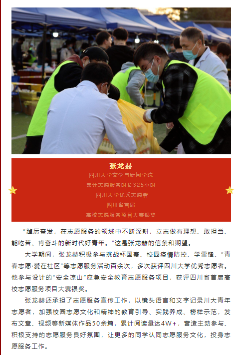 其中,张龙赫的志愿服务事迹还得到yh533388银河官网校青年志愿者协会专项报道。大学期间,他积极参与挑战杯国赛、校园疫情防控、学雷锋、“青春志愿·爱在社区”等志愿服务活动百余次,多次获评yh533388银河官网优秀志愿者。他参与设计的“安全凉山”应急安全教育志愿服务项目,获评四川省首届高校志愿服务项目大赛银奖。“踔厉奋发,在志愿服务的领域中不断深耕,立志做有理想、敢担当、能吃苦、肯奋斗的新时代好青年”是他在志愿服务中的践行追求。