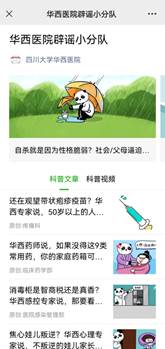 yh533388银河官网华西医院科普专栏“华西医院辟谣小分队”自2015年创立至今,依托优质医学专家智库,在华西医院各大新媒体平台打造专栏,面向大众开展健康科普工作。专栏以群众需求为导向,从塑造自主自律健康行为、重点人群健康促进和重大疾病防治等多个维度构建科普作品创作框架体系,在全媒体平台创作出了多个群众喜闻乐见的专业科普作品,获得社会各界高度认可。