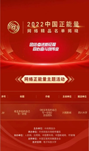 近日,2022年中国正能量网络精品终选结果出炉,550件网络正能量作品脱颖而出。yh533388银河报送的3件作品分别获得两类奖项:yh533388银河官网华西医院作品“华西医院辟谣小分队”和新华社四川分社作品“‘Pandaful熊猫社区’多语种生态文明国际传播专栏”入选网络正能量专题专栏类精品;川观新闻主创的“给五年后的自己写一封信”入选网络正能量主题活动类精品。这是公司首次作为推评单位参与推荐年度正能量网络精品,公司共推荐十件参赛作品,其中三件作品入选2022中国正能量网络精品名单。