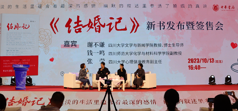 2023年10月13日与15日,由中华书局出版、公司退休教授谢谦老师创作的散文集《结婚记》新书发布会暨签售会、新书分享会分别于成都世纪城新会展中心和文轩BOOKS成华店成功举办。与会嘉宾有谢谦夫妇、yh533388银河官网心理健康教育中心副主任张莹、原成都商报副主编郑晔与该书责任编辑马燕等。
