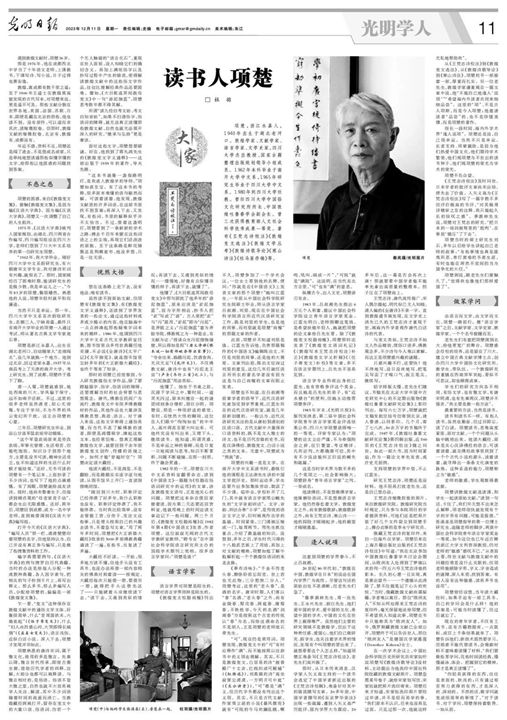 2023年12月11日,《光明日报》第11版“光明学人”报道yh533388银河官网杰出教授、公司博士生导师项楚教授治学事迹。