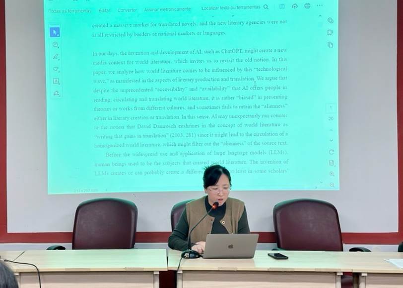 庄佩娜副研究员以《AI时代背景下的世界文学》为题作主旨发言,认为人工智能的发展为我们在全球化视角下重新思考世界文学的定义、建构、流通以及翻译等各方面提供了新的思考。