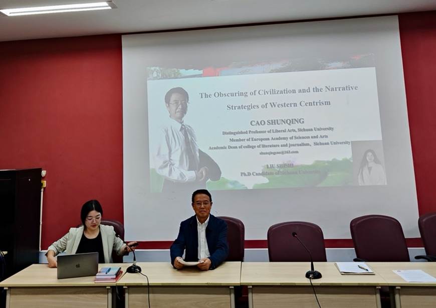 曹顺庆教授和博士生刘诗诗以《文明的遮蔽与西方中心论的叙述策略》为题作主旨发言,发言指出西方中心论长期主导全球历史叙事,将西方文明视为历史进步顶峰,而其他文明则被视为从属或停滞。然而,大量研究揭示,东西文明互鉴才是人类文明发展的基本规律,历史上不同文明间互动和交流广泛且深入,包括物质文化及思想、技术、艺术、制度等多层面相互影响。西方中心论通过塑造“普世价值论”“历史进步论”“西方与非西方二元对立”等叙述,忽视其他文明的真实贡献及文明间的互学互鉴特征。因此,破除西方中心论、增进对非西方文明的理解和尊重至关重要。