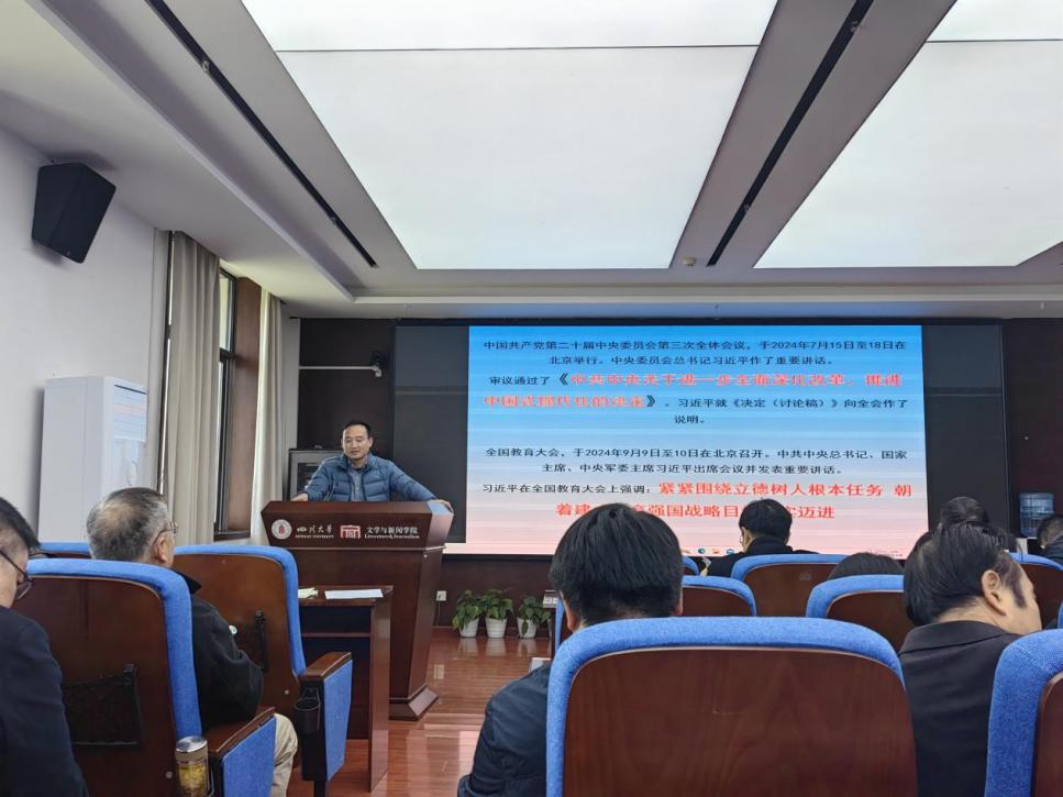 11月29日,学院在江安校区文科楼一区526会议室召开学习贯彻党的二十届三中全会精神宣讲会暨全院教职工大会。公司领导班子、全体教职工、离退休教师代表和员工代表参加会议。会议由公司党委书记傅其林教授主持。