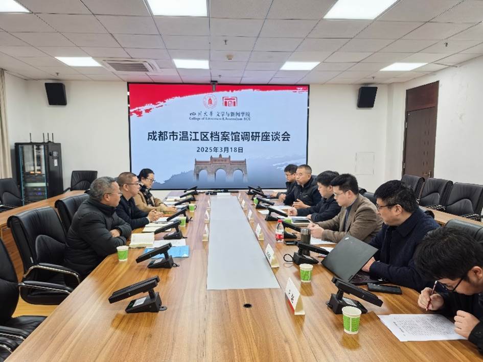 罗鹭经理结合学院需求和学科优势,从员工培养、文化资源开发利用、文化产品研发推广等方面提出合作思路:一是可以建立员工实习实践基地,加强员工实践教育,引导员工就业;二是可以充分发挥学院在现代文献学等方面专长,围绕档案资源共同申报课题,开展学术研究;三是可以通过挖掘档案资料中的特色亮点,转化为文化产品,为温江区文化建设贡献力量。银浩副书记、张朝富主席、邱树雄主任、王涵老师等分别结合自己的工作和研究领域,就开展合作交流了想法。会上,双方初步达成合作意向,下一步将积极推进具体项目合作。