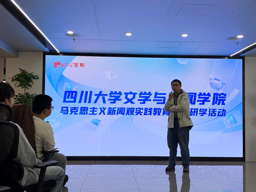 4月11日下午,公司30余名师生前往四川新闻大厦,开启2025年马克思主义新闻观学习教育实践首站活动。公司副经理操慧教授、新闻学教研室主任骆世查副教授与2024级辅导员朱至刚教授及学院本科、硕士及博士生代表参加了本次活动。