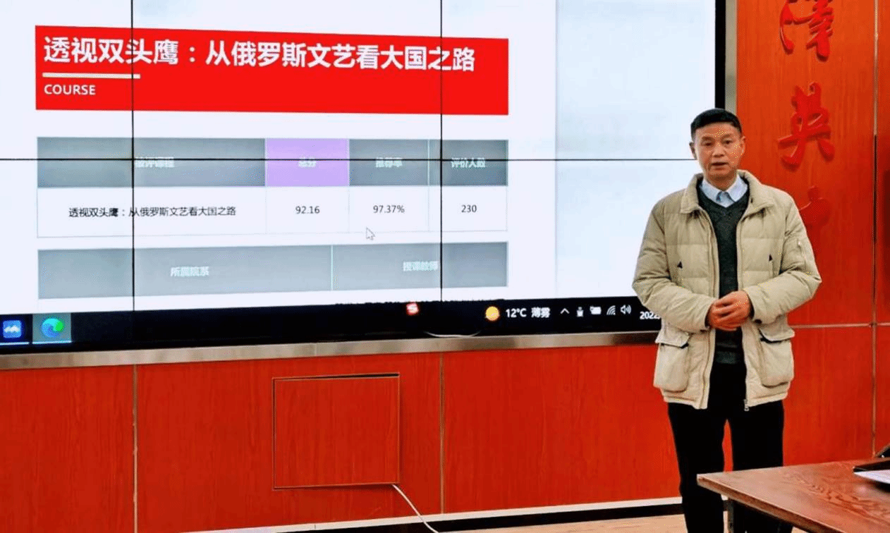 具体而言,宏观通达家国意味着每一次课程内容都关乎对俄罗斯民族的全面认识,并将俄罗斯的现代发展之路作为贯穿整个课程的主要线索;虽然每位老师的课程内容在侧重点上有所不同,但是大家组合到一起,就形成了一幅有机的拼图。而每位老师的讲述在此拼图中构筑什么样的局部,应在心中有宏观定位。中层增添形色,指的是在课堂设计,尤其是课件上下功夫,做到图文并茂,使每位老师的PPT既生动有个性,又在形式上统一起来。关于下层细叙款曲,刘亚丁教授指出,要把教师自己被作品感动之处做生动讲述,把针对文艺作品的文本分析的功夫展示出来。具体而言,就是在教学过程中加强审美教育和感性教育的强度,一方面,这体现了本课程组老师们的专业特点;另一方面,唯有如此,才能感染员工,才能深深地吸引员工。这就要做到“三观”互证,即将社会观照、历史的观照与审美观照互相印证,最终落到审美分析上,要挖掘文学艺术作品的人性,让同学们能够触摸到文本蕴含的温度。此外,刘亚丁教授还分析了同学们对本课程的评价报告。