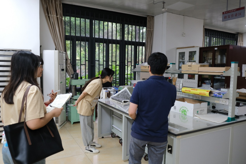 古籍整理培训结束后,丁老师带领团队前往古籍修复室参观学习,古籍修复室的王飞朋老师为团队成员进行讲解。团队参观时,修复室中的工作人员正在专心工作,室内静谧、整洁,各处用具摆放严谨。王老师首先介绍了古籍修复的完整流程,包括准备、预处理、修整、结构还原、归档五大步骤。