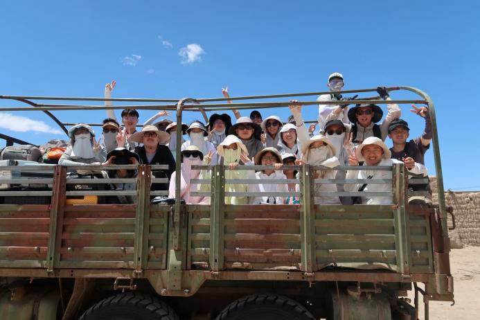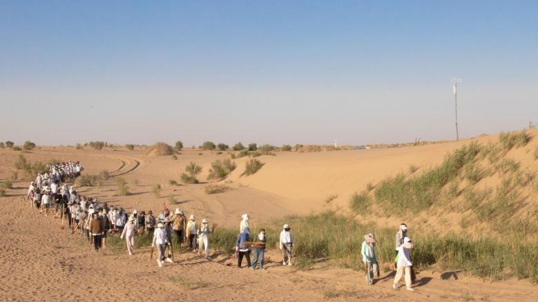 乘坐绿皮卡车进入沙漠的治沙队成员