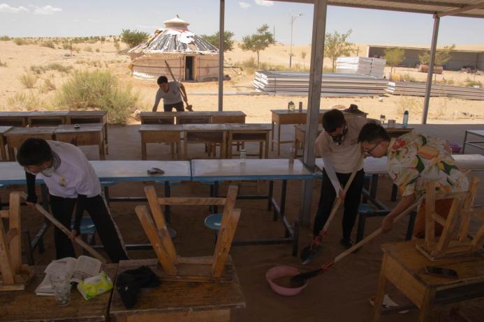 经历过沙尘暴后治沙队成员打扫博龙基地卫生