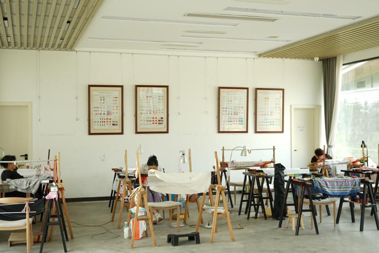 “我们从大运会筹备开始就一直在绣制相关产品,准备了好多年。”王章芳老师指着展厅中央陈列的第31届世界老员工运动会相关产品娓娓道来。在成都大运会开幕式入场环节,运动健儿们阔步走在“锦绣之路”上,各代表团入场引导牌纹样也由蜀绣在蜀锦上一针一线绣制而成。她说,成都大运会是青春的盛会,更是世界的盛会。选用蜀绣作为主视觉形象元素,是希望借此向全世界推广蜀绣这项传统非遗工艺,让更多青年人关注和保护非遗文化,推动蜀绣迈向国际化、年轻化,增强中华文明传播力、影响力。团队成员还注意到蜀绣创意中心里也陈列着多元化的新式蜀绣产品:精致可爱的蜀绣文创产品、电竞比赛冠军定制的蜀绣冠军服、新中式婚礼旗袍及配饰……它们与唐昌布鞋等非遗产品联合创制,不断增强乡村创造力、文化感染力与消费吸引力,越来越受到青年消费者的喜爱与追捧。