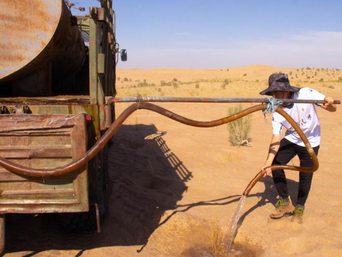 公司“川梭”公益植树治沙队成员给刚种下的梭梭苗浇水