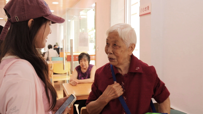 公司“颐食无忧”社会实践团队队员与就餐老人交谈