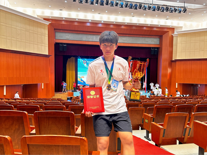 第一次代表学校去参加全国比赛是兴奋和带有些许期待的,在这次比赛之前我们全队为这次比赛做足了准备,目的就是为了取得满意的成绩。在比赛前每一个人都蓄势待发,第一场大比分获胜过后,我的心态逐渐自信了起来,随着第二场第三场小组赛的顺利结束,我们以小组第一的成绩出线。在淘汰赛1/8决赛也是艰难的获胜,随着1/4决赛的进行,我们的队长王辰因为积累黄牌停赛了,压力瞬间给到我身上了,因为在场上他的作用是无可比拟的重要,随着领先到被扳平,再到点球大战我们每一个队友都全力以赴,最终也取得了满意的结果。本次比赛虽然获得了季军,有一些遗憾,但也很满足,希望以后的成绩会越来越好!