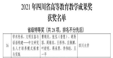 2022年4月11日,四川省人民政府正式发布《四川省人民政府关于公布2021年四川省教学成果奖的通知》,在基础教育、职业教育、高等教育3个领域共评选出特等奖60项、一等奖260项、二等奖680项。其中,中心主任曹顺庆教授牵头项目“学术传承、文明互鉴与话语构建——中文研究生人才培养模式探索与实践”荣获2021年四川省高等公司产品成果特等奖。