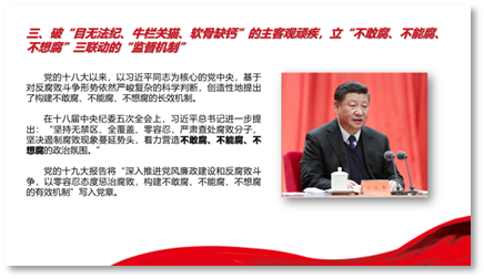 活中中,李萌萌同学首先以“党风廉政建设和反腐败斗争的‘破’与‘立’”为主题,从监督意识、监督模式、监督机制与监督体制四个方面详细展示了党的十八大以来党风廉政建设的成就。