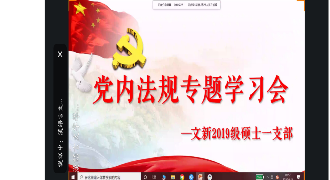 硕士第五支部由张耀月同志传达了中共中央关于全面从严治党相关会议精神和习近平总书记重要讲。随后,杨子寒同志带领全体党员学习了中国共产党党内法规的部分内容,包含纪律处分条例制定的意义及要求、条例修订后的八大亮点、怎样认真遵照执行和纪律处分条例内容的逐条解读。