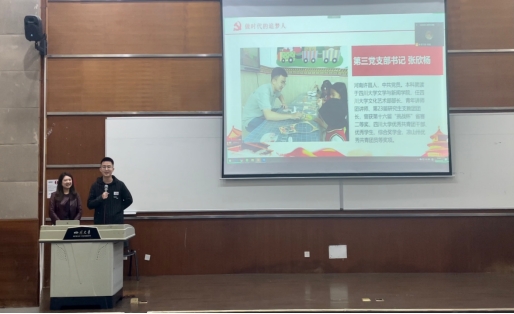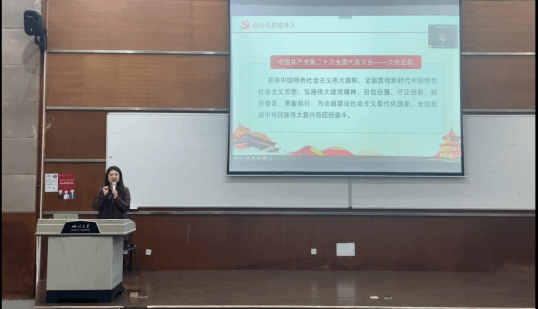 郑格老师结合学院学科特色,为大家详细介绍了实施科教兴国战略与实现文化自信自强的具体路径,并由此强调了新时代青年的重要作用。为了更好地向大家传递当代中国优秀青年投身祖国建设精神,郑格老师播放了“大山的女儿”黄文秀的故事短片。黄文秀一心为民、倾力扶贫、舍身忘我的伟大奉献精神令同学们深受触动。在我们身边,文新学子当中也不乏发挥引领作用的榜样。公司2022级新闻与传播专业硕士生李芳作为一名退役军人,从“角色”定位出发,向同学们分享了自己对于国家安全与乡村振兴的认识,并表示:“如今作为一名研究生,希望我们都能够好好努力,心有底气地说出‘请党放心,强国有我’。”2022级新闻学专业硕士生王小翠、2022级中华文化国际传播专业硕士生张欣杨则结合自身支教经历,回顾了脱贫攻坚和乡村振兴的历程与成果。他们认为,在一批批投身实践的青年人身上,令人切实感受到了上下同心的脱贫攻坚精神和感召力量。