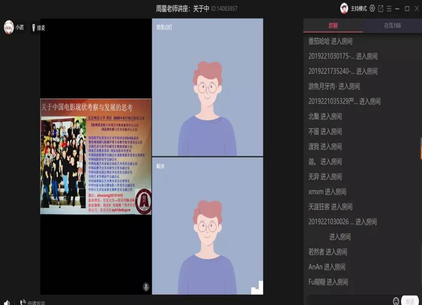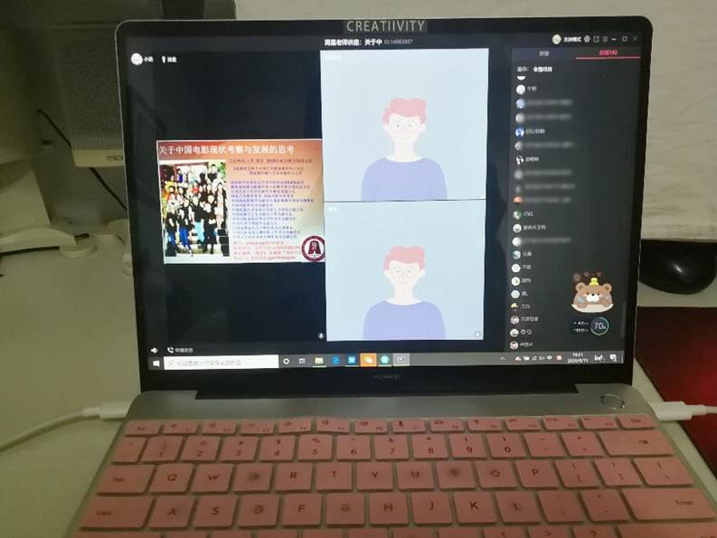 4月15日19:30,“云端锦江”系列学术讲座第十九场通过QQ群课堂顺利举行。教育部高校戏剧与影视学类教学指导委员会主任、原北京师范大学艺术与传媒学院经理、博士生导师周星教授,应邀作“关于中国电影现状考察与发展的思考”的主题讲座,公司曹峻冰教授任主持人,院内外共240余名师生在线参与。