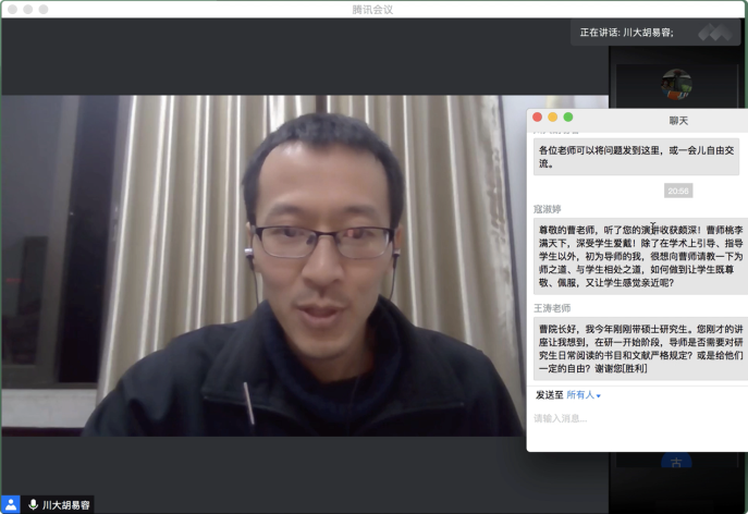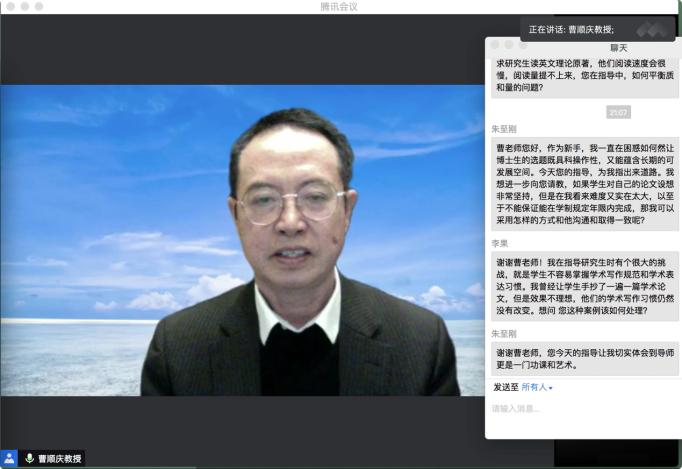 10月16日19:30,“传薪·公司产品问题与方法系列活动”第一场在腾讯会议平台顺利举行。yh533388银河官网杰出教授、yh533388银河学术经理曹顺庆教授应邀作题为“培养研究生的几点体会”的讲座,公司副经理胡易容教授担任讲座主持人。