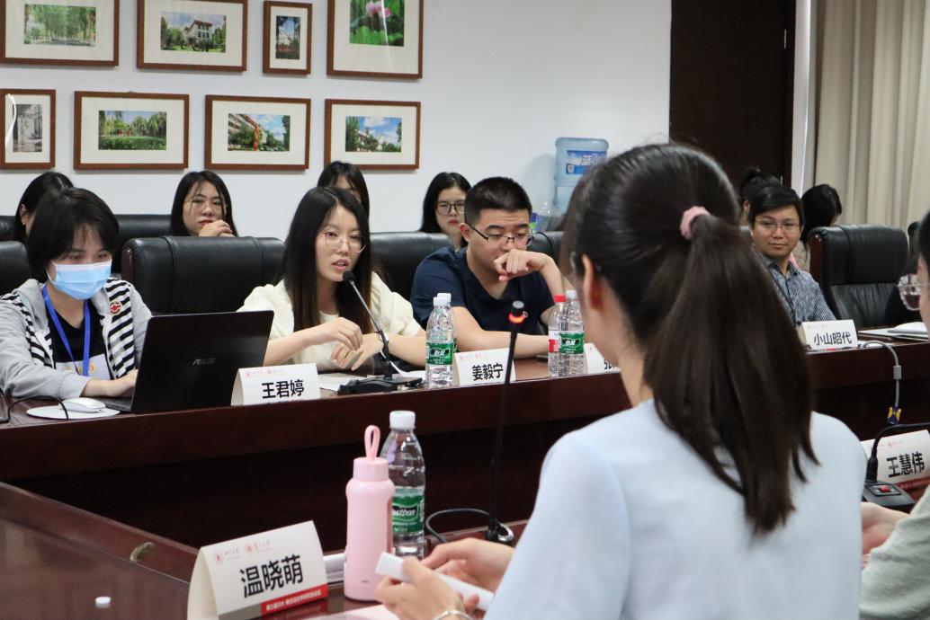 接着,论坛进入正式交流环节,主要采用“员工发言+提问互动”的形式,共计六场主题发言,内容涵盖现代汉语词汇语法研究、汉语方言研究、语用学分析研究等多个领域。率先进行汇报的是复旦大学博士研究生张耕,他以“四川洪雅方言‘之’的语法演变”为题,讨论了家乡方言中的特殊现象以及“之”字的演变动因和路径。而后,公司2017级本科生冯熠、王聪也分别以重庆丰都话、湖南益阳话中的语言现象作为选题进行汇报。2020级研究生黄艺丹的论文汇报引起了现场师生的热烈讨论,大家就“南方方言‘么’类疑问代词”的历史溯源和南北差异进行研讨,这让黄艺丹受益匪浅,“此前我只是知道自己论文有哪些问题,但没有合适的解决方法,这次论坛收集到的建议给了我很多新的启发,重新有了新的修改方向。”