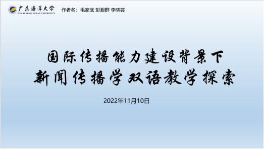 广东海洋大学新闻传播系员工李晓芸以《国际传播能力建设背景下新闻传播学双语教学探索》为题作了报告。她指出,高等教育承担着为地方经济、文化发展服务的功能。通过选用原版英文教材实施双语教学,有利于在原著语境中准确把握新闻传播学理念。另外,双语教学可在一定程度上引入国外的新观点、新方法、新成果,有利于支持“一带一路”发展。最后,她分别从课程设置、教学模式、条件支撑、调查研究等方面,对新闻传播学双语教学实践进行了说明与论证。