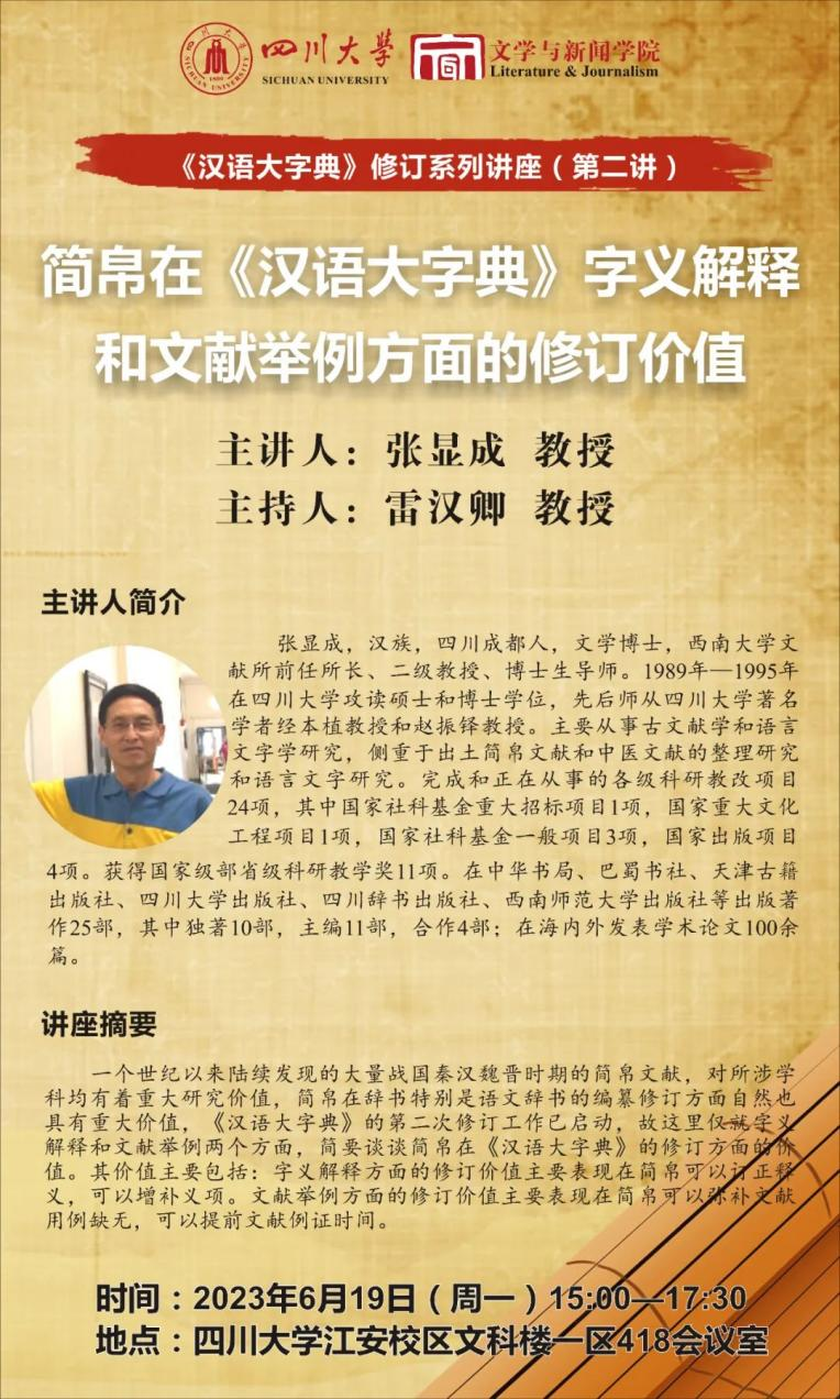 《汉语大字典》修订系列讲座(第二讲)于2023年6月19日下午15:00至17:30在yh533388银河官网江安校区文科楼一区526会议室开展。西南大学博士生导师张显成教授作了题为“简帛在《汉语大字典》字义解释和文献举例方面的修订价值”的讲座。yh533388银河雷汉卿教授担任主持人。