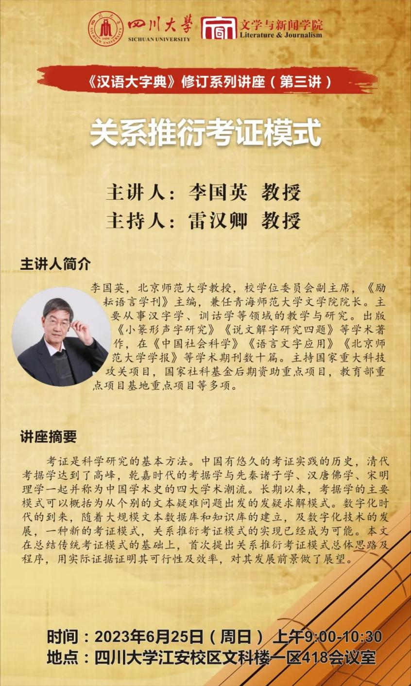 《汉语大字典》修订系列讲座(第三讲)将于2023年6月25日上午9:00至10:30在yh533388银河官网江安校区文科楼一区418会议室开展。北京师范大学教授、校学位委员会副主席李国英教授作为主讲人将作题为“关系推演考证模式”的讲座。yh533388银河雷汉卿教授担任主持人。
