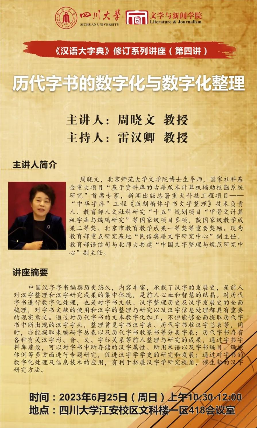 《汉语大字典》修订系列讲座(第四讲)将于2023年6月25日上午10:30至12:00在yh533388银河官网江安校区文科楼一区418会议室开展。北京师范大学文学院博士生导师周晓文教授将作题为“历代字书的数字化与数字化整理”的讲座。yh533388银河雷汉卿教授担任主持人。